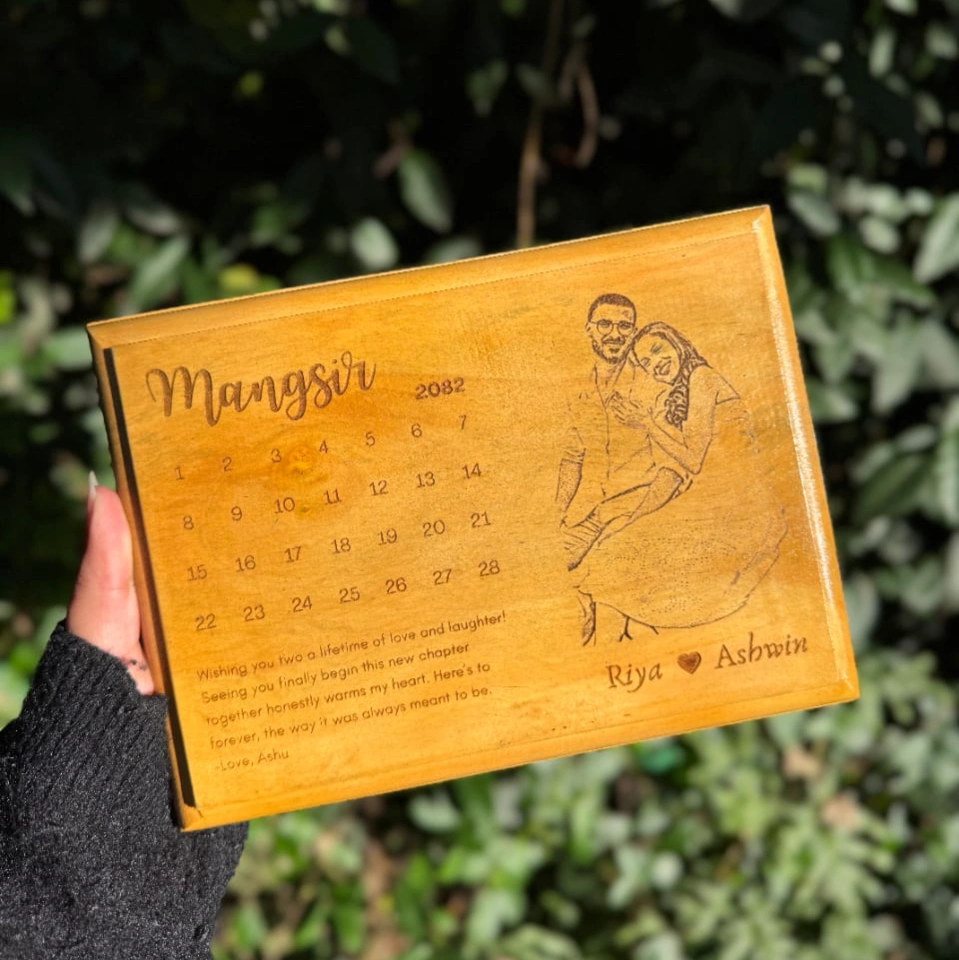 Custom Message & Names: Includes space for personalized names (Riya $\heartsuit$ Ashwin), and a heartfelt, engraved message or dedication ("Wishing you live a lifetime of love and laughter...") to make the gift deeply meaningful.