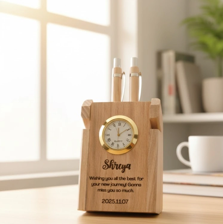 This exquisitely crafted wooden pen stand is the perfect blend of functionality and heartfelt sentiment. Made from high-quality wood, it features two slots to neatly hold your favorite pens and an integrated classic analog clock for easy timekeeping on your desk.