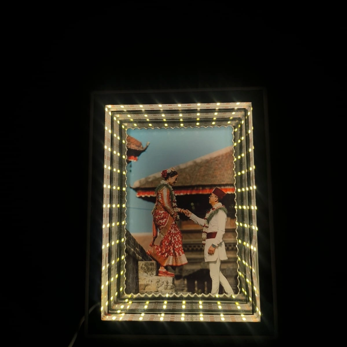 Commemorate the beautiful union of the newlyweds with a unique customizable Infinity Mirror featuring their cherished wedding photos and a heartfelt personal message.