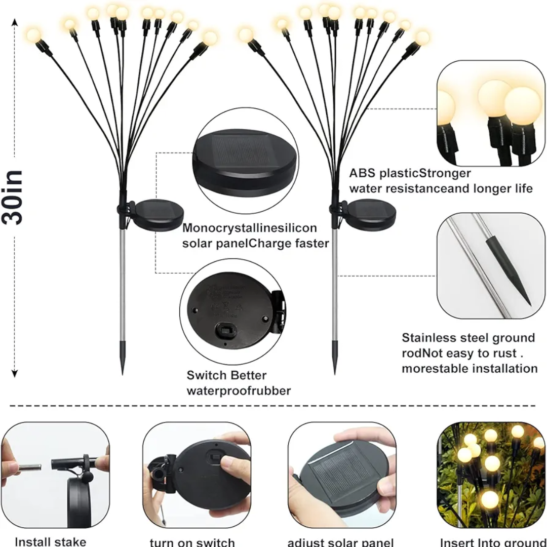 Experience the market's most unique solar decorative lights that sway like fireflies in the dark when the wind blows. Our outdoor garden lights offer the finest swaying effect with specialized iron wire for a 360° sway angle. The heavy-duty bulb base enhances sway momentum, creating an enchanting sway. Designed by a specialized team for a plant simulation appearance that seamlessly blends with the environment day and night, no longer just beautiful in the dark.